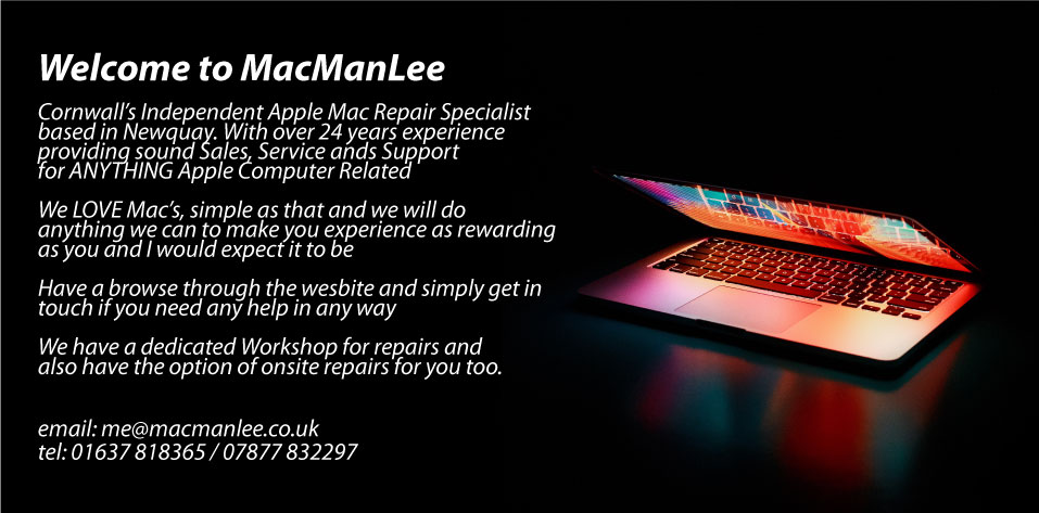 Welcome to MacManLee, INDEPENDENT Apple Mac Repair Specialist based in Cornwall, with over 20years experience providing sound Sales, Service and Support for anything Apple Mac.We love Mac’s! Simple as that, and we will do everything we can to make your Apple Mac experience as exciting and rewarding as you and I would expect it to be.